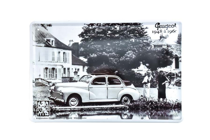 Peugeot 203 metal plate at the water's edge, black and white. To be fixed to the wall. Dimensions: 30 x 20 cm.
