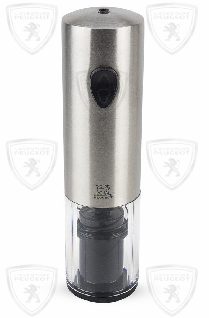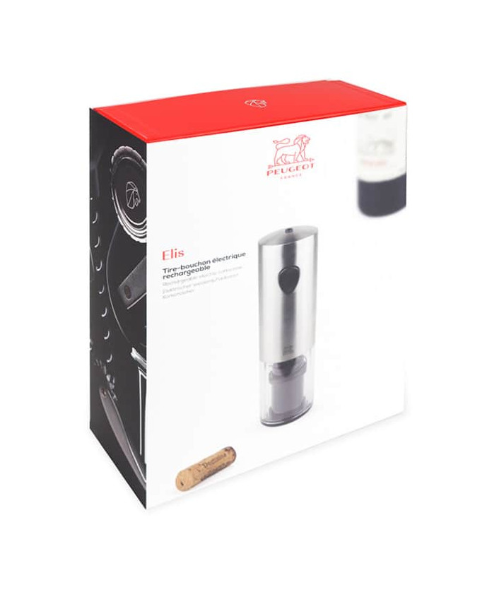 Simple to use, with high performance and a pleasing appearance, thePeugeot Elis rechargeable electric corkscrew is a treat for all winelovers and connoisseurs. This electric corkscrew has been designed toopen the finest vintages or simple local wines equally effortlessly injust a few seconds. It will fit any bottle and remove any type of cork.Once positioned on the bottle, a single press on the lower part of thebutton will ensure that the corkscrew goes into the cork to then take itout of the bottle. A second press on the upper part of the button willremove the corkscrew from the cork. This rechargeable electric corkscrewis supplied in a case with its charger. Its design in stainless steelmakes it a very beautiful contemporary object for home or forrestaurants.