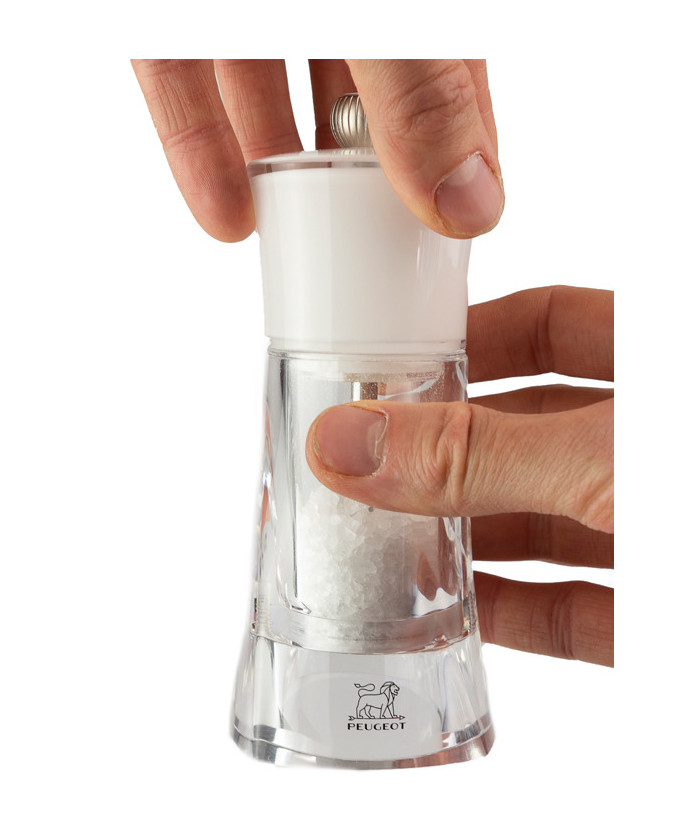 The Peugeot Molène salt mill combines the transparency of an acrylic body and the purity of a white head. A pure and subtle combina tion that will surely illuminate your table.