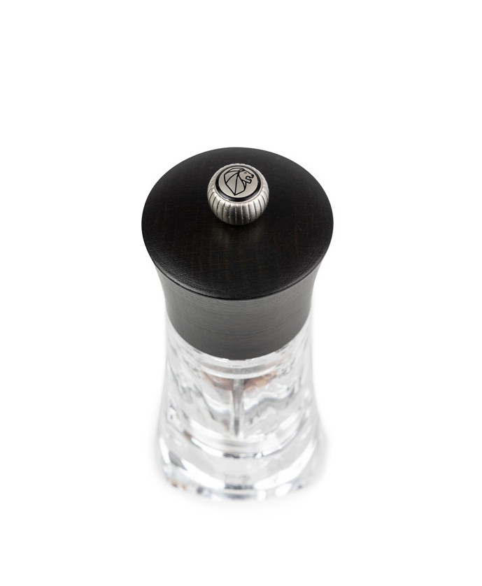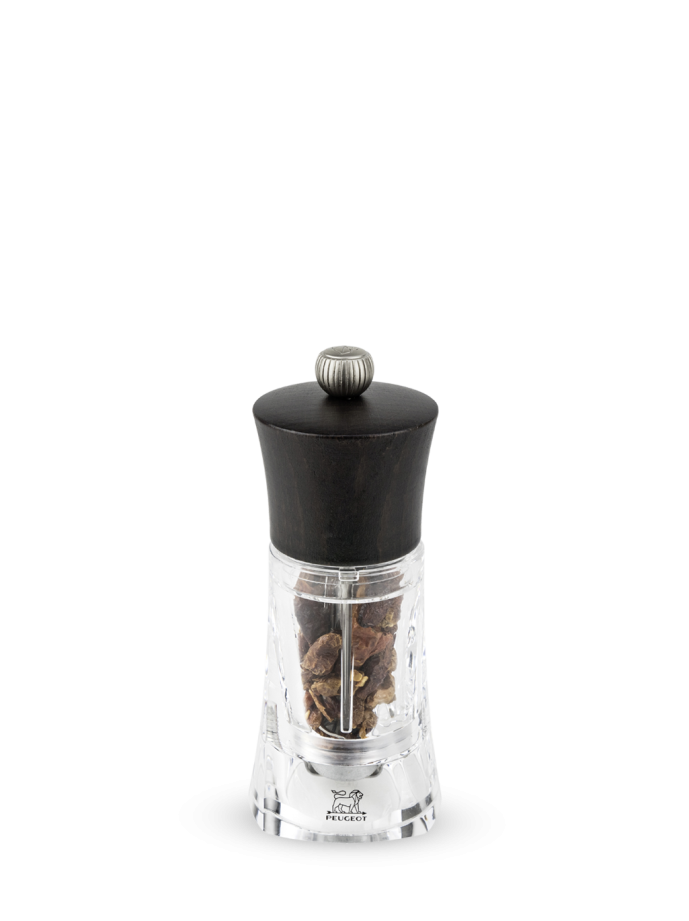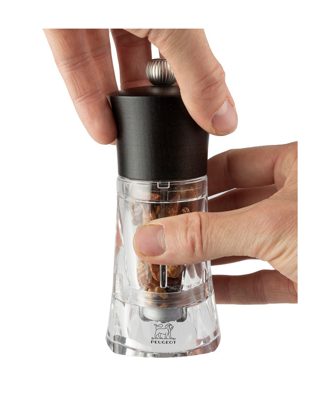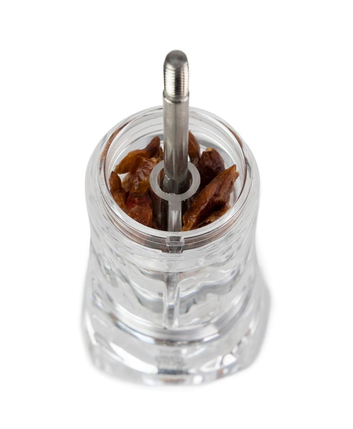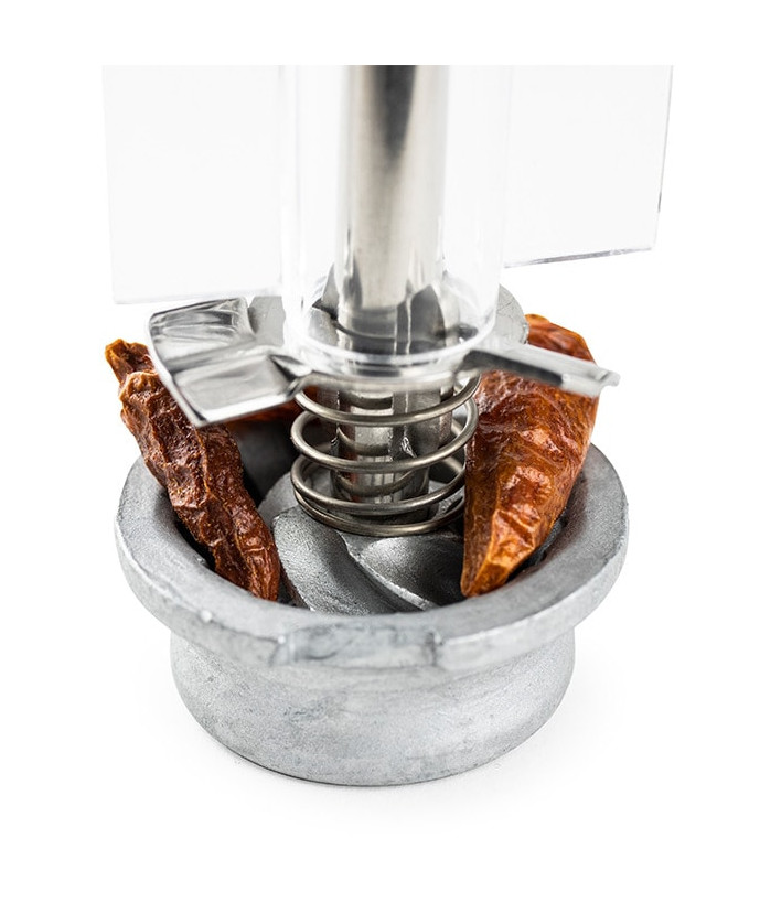 The chocolate finished Oléron chili pepper mill is designed to make it absolutely simple to grind dried chili peppers. Its patented mechanism, which comes with a lifetime guarantee, pre-minces the chili pepper before grinding it finely. Ideal to bring some spice to your meals! This compact mill with its elegant silhouette consists of a transparent body with a slight twist and a head in chocolate finished wood. It will go perfectly with the pepper mill or salt mill of the same collection to create an exquisite duo.