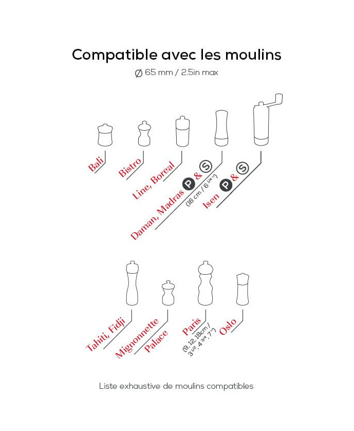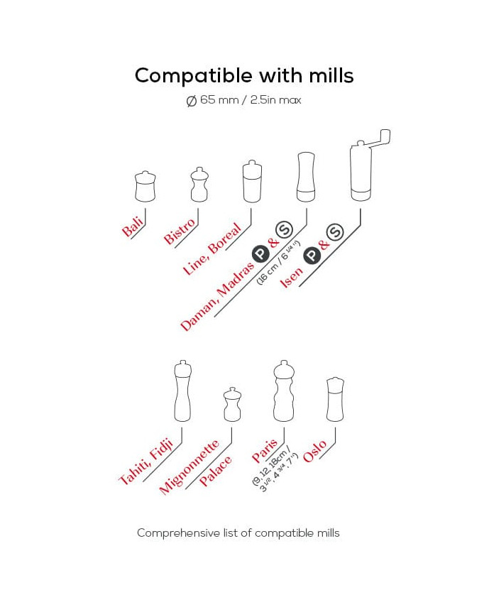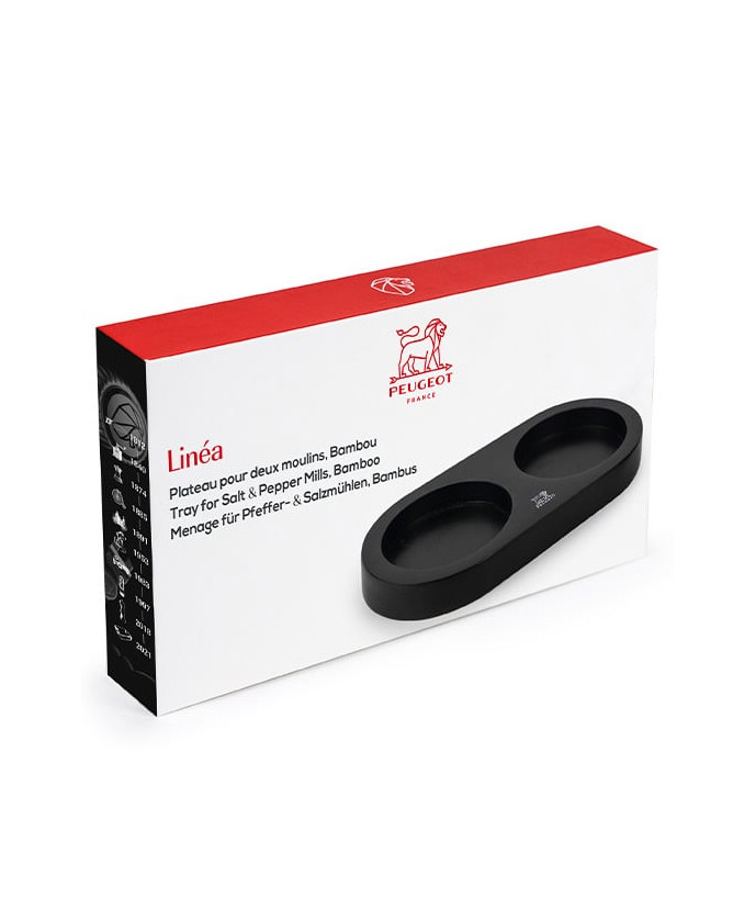 Use this compact bamboo tray to store and carry your duo of salt and pepper mills. Presented in a gloriously timeless matt black shade, it will go perfectly with the great majority of colors and finishes in the Peugeot mill range. This is a practical item, easy to carry from work surface to table, so that no salt and pepper residue is left on your surfaces. This mill tray from Peugeot is easy to clean with a damp cloth. Suitable for all mills with a diameter of 65 mm or less - Ergonomic stainless steel handle to make it easy to carry your duo of mills - To store your duo of mills without leaving any salt or pepper residue on your surfaces - Easy to clean - Suitable for all mills with a diameter of 65 mm or less - Not suitable for the Oléron, Molène, Ouessant, Isen linseed and Isen lon