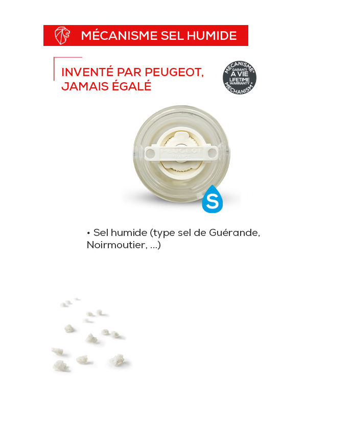 The island of Oléron, renowned for its salt marshes, inspired Peugeot to create this special wet salt mill. The mill's design combines the transparency of acrylic with the softness of chocolate-colored wood. The body of the Oléron mill reveals the wet salt crystals it contains. The knob located above the mill adjusts the salt grind. Its Zirlion mechanism, the result of Peugeot Research and Development, is completely corrosion-resistant and features stirring fins that guide the salt, even when clumped, and ensure a constant flow. This mechanism is guaranteed for an unlimited period. - Care: Wipe clean with a soft, dry cloth / Do not place in the dishwasher or water - Made in France - PEFC wood from sustainably managed French forests - Zirlion mechanism, a Peugeot innovation - Grinding adjustment knob: The tighter the knob, the finer the grind (and vice versa) - 5-year warranty - Wet salt mill: Patented ceramic mechanism specially designed for grinding wet salt crystals (Guérande salt, Noirmoutier salt, etc.) - Spices NOT INCLUDED