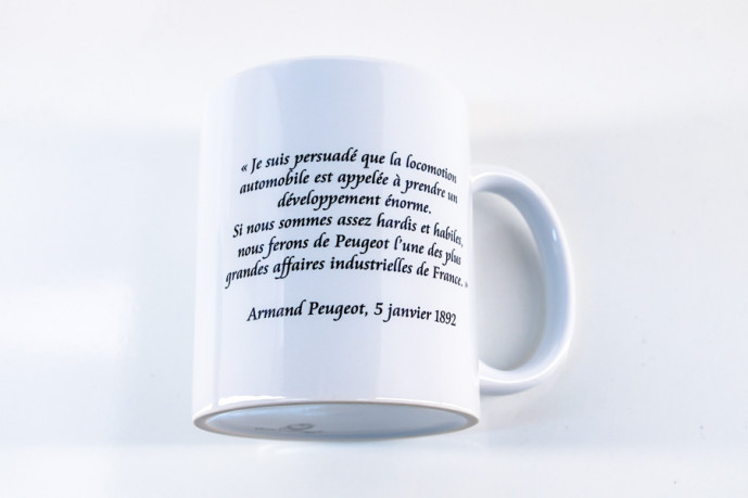 Création exclusive et originale de L’Aventure Peugeot avec ce mug en céramique de 320 ml. Impression haute qualité avec revêtement spécial pour assurer la durabilité de l'image. Adapté au lave-vaisselle et au micro-ondes. Citation Armand Peugeot et logo de L'Aventure Peugeot.