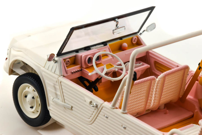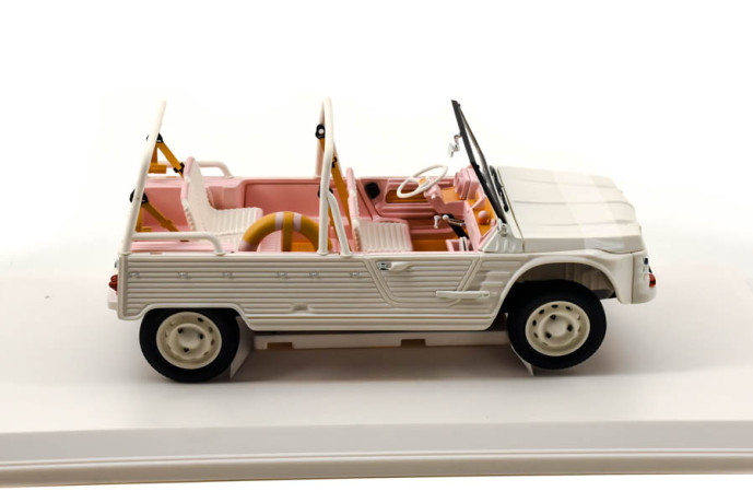 1/18 MEHARI SORBET BLANC ET ROSE La Citroën Méhari Sorbet électrique se décline désormais en miniature 1/18 signée Norev, avec nouveau moteur et batterie sous le châssis. Son habitacle rose et ses sièges osier assortis à la carrosserie blanche séduisent par leur originalité. Gourmande pour les yeux comme une glace à la fraise, cette Méhari allie authenticité, créativité et élégance, offrant un souffle de fraîcheur et une véritable bouffée de plaisir pour les collectionneurs. MARQUE : NOREV