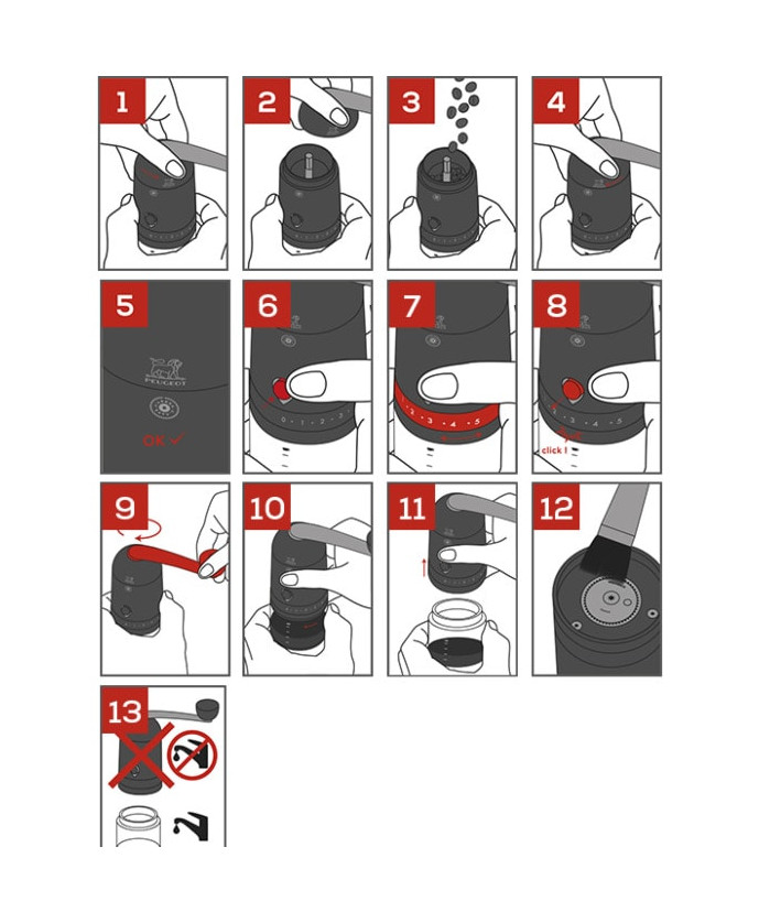 Avec ce moulin à café Peugeot, l’amateur de bon café peut réaliser la mouture parfaite quelle que soit sa méthode d’extraction. Qu’il apprécie l’espresso, le filtre, le piston, ou le cold brew, il peut sélectionner la mouture adéquate d’un simple geste. Son réglage de mouture u’Select, facilement accessible, la qualité extrême de son mécanisme en acier et le design de la manivelle font de ce moulin à café manuel un objet aussi séduisant que performant. Les connaisseurs le savent, le café est un univers marqué par la diversité des origines, des torréfactions et des préparations. La fraîcheur de la mouture est l’un des facteurs clefs de la qualité. Moudre son café de façon instantanée permet de préserver toute l’intensité et ses arômes. Le mouli