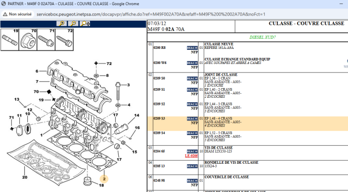 JOINT DE CULASSE EPAISSEUR 1,48 - 4 CRAN MARQUE MEILLOR-205 - 306 - 309 - 405 - PARTNER - BERLINGO - BX - C15 - XSARA - ZXDIESEL ET XUD7